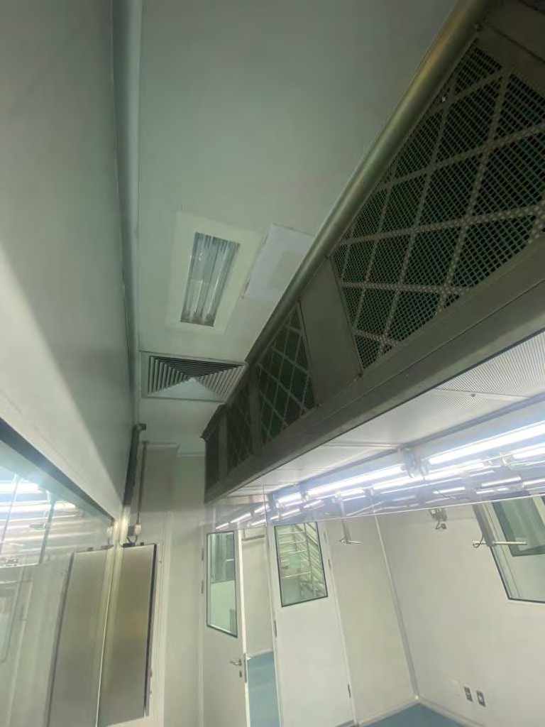Obra Turn Key para a substituição integral dos módulos de fluxo laminar unidirecional na área de envase asséptico de injetáveis da Brainfarma (Hypera Pharma), ambiente classificado Grau A sobre Grau B (ISO 5/ISO 7). O escopo incluiu a desmontagem de 5 fluxos laminares obsoletos e 1 forro filtrante, seguida da instalação de 6 novos módulos de fluxo laminar com filtros HEPA H14, velocidade de face controlada a 0,45 m/s (+/- 20%) e sistema microprocessado com comunicação via rede para integração ao supervisório fabril (SCADA).