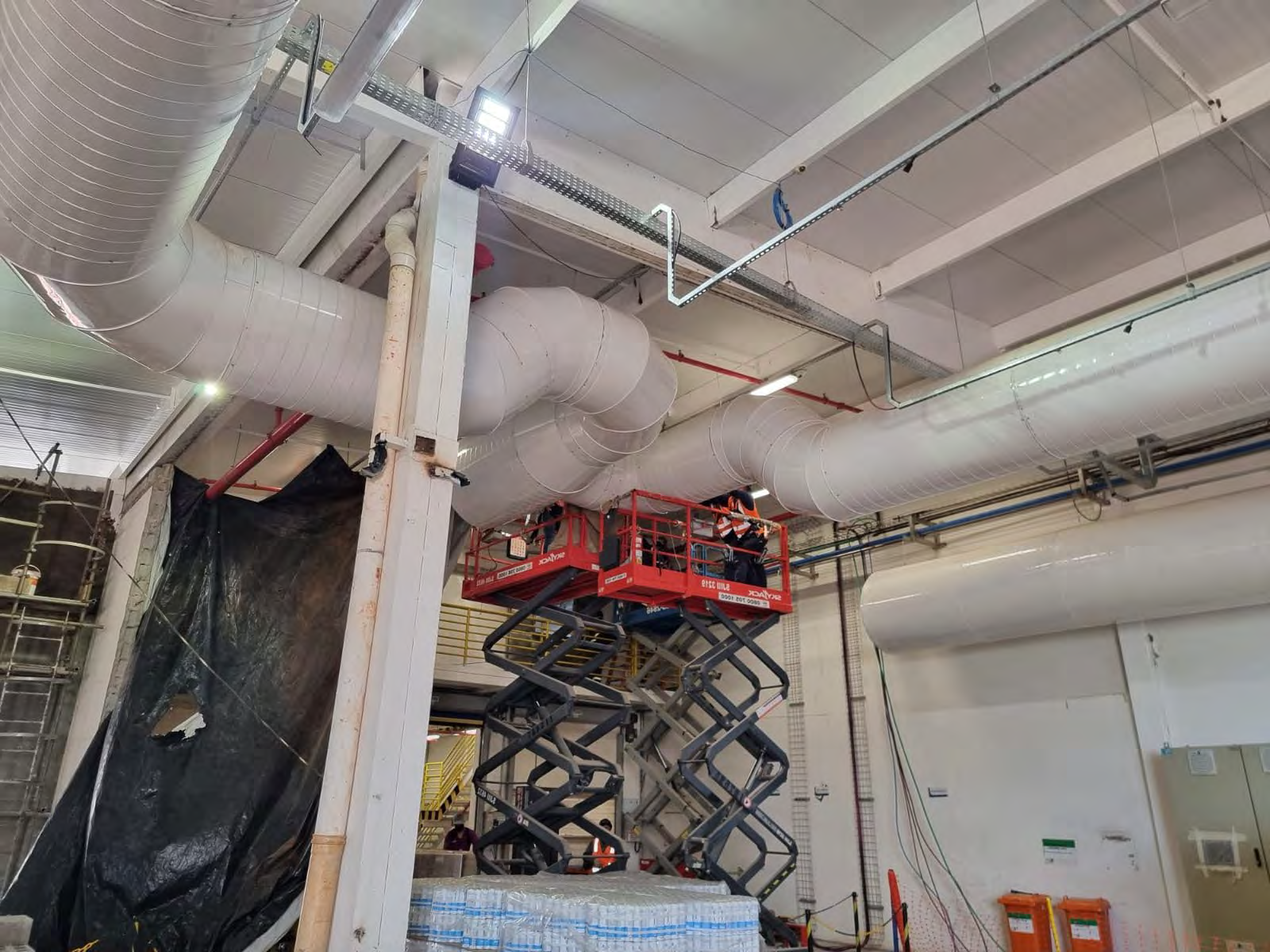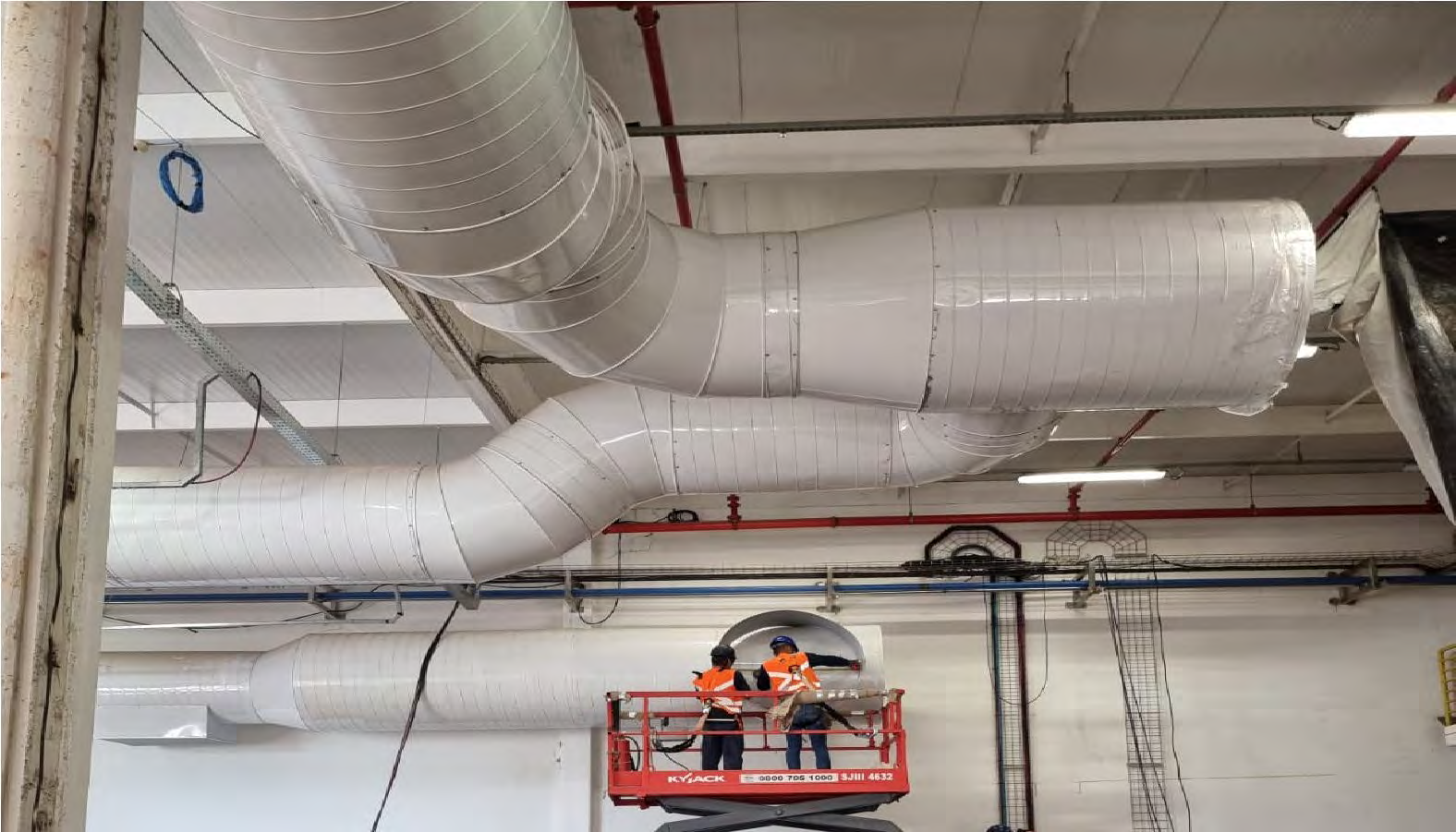 A insuflação é realizada por 3 ventiladores centrífugos de dupla aspiração com gabinetes de ventilação equipados com filtragem G4 e dampers motorizados. A exaustão conta com 3 exaustores industriais à prova de explosão, posicionados estrategicamente para garantir a diluição uniforme dos vapores. A rede de dutos em aço galvanizado padrão girotubo (circular espiralado) recebeu pintura eletrostática para resistência à corrosão, com suportes e fixações dimensionados conforme SMACNA.